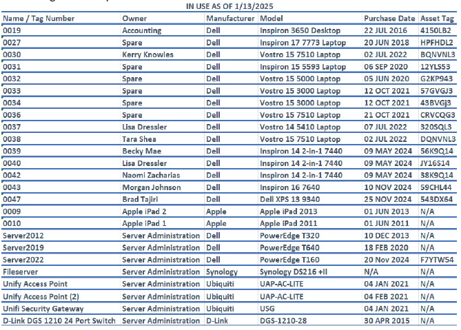 1. Initial Assessment – Compile/update inventory of all information technology-related assets, assess systems and make recommendations for improved IT system performance for future capital consideration, along with an annual technology assessment consultation and report recommendations.
